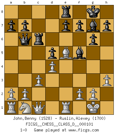 Last move : 1-0 2009 February 6 8:39:23 [Event "FICGS__CHESS__CLASS_D__000101"] [Site "FICGS"] [Date "2008.09.02"] [Round "1"] [White "John,Benny"] [Black "Ruslin,Alexey"] [Result "1-0"] [WhiteElo "1528"] [BlackElo "1700"] 1.e4 c6 2.Bc4 d5 3.exd5 cxd5 4.Bb3 Nf6 5.h3 g6 6.Nf3 Bg7 7.O-O Nc6 8.d4 O-O 9.c3 Bf5 10.Bf4 Rc8 11.Re1 Re8 12.Ba4 Qb6 13.Bxc6 Rxc6 14.Qc1 Nd7 15.Ne5 Nxe5 16.Bxe5 1-0 This chess game has been lost on time (started : 2008.09.02 5:17:17) Caro-Kann : Hillbilly attack Kingside Castling by player White (move 7) Kingside Castling by player Black (move 8) Player White won this chess game. Follow this game move after move (download)The tactician must know what to do whenever something needs doing; the strategist must know what to do when nothing needs doing. (Savielly Tartakover) Du musst nicht gut spielen, es reicht, wenn du besser spielst als dein Gegner. (Anonymous) Vive, pierde y aprende al observar a tu oponente como gana. (Amber Steenbock) Soyez une menace à chaque fois que vous vous asseyez pour jouer. (Ken Smith) A shortcut is the longest distance between two points. (Don Groves)