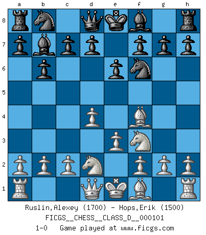 Last move : 1-0 2008 October 13 23:22:30 [Event "FICGS__CHESS__CLASS_D__000101"] [Site "FICGS"] [Date "2008.09.02"] [Round "1"] [White "Ruslin,Alexey"] [Black "Hops,Erik"] [Result "1-0"] [WhiteElo "1700"] [BlackElo "1500"] 1.d4 Nf6 2.Nf3 e6 3.Bf4 b6 4.e3 Bb7 5.Nbd2 1-0 This chess game has been lost on time (started : 2008.09.02 5:17:17) Queen's pawn game Player White won this chess game. Follow this game move after move (download)By playing at Chess then, we may learn: First: Foresight... Second: Circumspection... Third: Caution... And lastly, we learn by Chess the habit of not being discouraged by present bad appearances in the state of our affairs, the habit of hoping for a favorable chance, and that of persevering in the secrets of resources. (Benjamin Franklin) Charakterschwächen offenbaren sich normalerweise während einer Schachpartie. (Garry Kasparov) El Ajedrez es un expediente tonto que hace creer a la gente inactiva que hacen una cosa muy astuta cuando solamente estan perdiendo su tiempo. (George Bernard Shaw) Mon pion favori sur ma case favorite ! Bronstein en parlant d'un coup de pion en h5 quand il avait les Noirs. In my experience, there's no such thing as luck. (Obi-Wan Kenobi in Star Wars ep.4)
