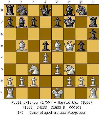 Last move : 1-0 2008 October 5 1:20:6 [Event "FICGS__CHESS__CLASS_D__000101"] [Site "FICGS"] [Date "2008.09.02"] [Round "1"] [White "Ruslin,Alexey"] [Black "Harris,Cal"] [Result "1-0"] [WhiteElo "1700"] [BlackElo "1800"] 1.d4 d5 2.Nf3 f5 3.Bf4 h6 4.e3 b5 5.Bxb5+ Kf7 6.Nc3 g5 7.Be5 Rh7 8.Qd3 Bb7 9.Qxf5+ 1-0 Queen's pawn game Player White won this chess game. Follow this game move after move (download)All Chess players should have a hobby. (Savielly Tartakower) Im Reiche der Wirklichkeit ist man nie so glücklich wie im Reiche der Gedanken. (Arthur Schopenhauer) Siempre es mucho mejor sacrificar las piezas de tu oponente. (Savielly Tartakover) On peut tirer plus d'utilité d'une partie perdue que de 100 parties gagnées. (Capablanca) The real danger is not that computers will begin to think like men, but that men will begin to think like computers. (Sydney J. Harris)