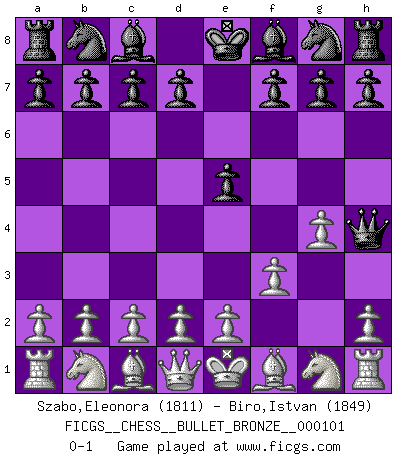 Last move : 0-1 2009 April 7 12:22:53 [Event "FICGS__CHESS__BULLET_BRONZE__000101"] [Site "FICGS"] [Date "2009.04.07"] [Round "1"] [White "Szabo,Eleonora"] [Black "Biro,Istvan"] [Result "0-1"] [WhiteElo "1811"] [BlackElo "1849"] 1.f3 e5 2.g4 Qh4+ 0-1 Gedult's Opening Player Black won this chess game. Follow this game move after move (download)Chess is the gymnasium of the mind. (Blaise Pascal) Im Schach gibt es keinen Platz für Galanterie. (Irving Chernev) Alekhine es un poeta que crea un trabajo de arte de algo que raramente inspiraría a otra persona a mandar una tarjeta postal. (Max Euwe) Le moment que je préfère le plus dans une rencontre, c'est celui où je sens que la personnalité de l'adversaire se brise. (Robert Fischer) Now you put water in a cup, it becomes the cup; You put water into a bottle it becomes the bottle; You put it in a teapot it becomes the teapot. Water can flow or it can crash. Be water, my friend. (Bruce Lee)