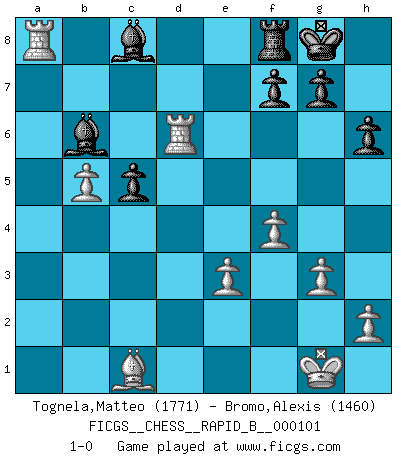 Last move : 1-0 2008 September 10 13:51:42 [Event "FICGS__CHESS__RAPID_B__000101"] [Site "FICGS"] [Date "2008.09.02"] [Round "1"] [White "Tognela,Matteo"] [Black "Bromo,Alexis"] [Result "1-0"] [WhiteElo "1771"] [BlackElo "1460"] 1.Nf3 d6 2.g3 e5 3.Bg2 Nc6 4.d3 h6 5.O-O Nf6 6.c4 Be7 7.Nc3 a6 8.d4 e4 9.Nd2 Nxd4 10.Ndxe4 Nxe4 11.Nxe4 Ne6 12.f4 b5 13.Nxd6+ Bxd6 14.Bxa8 Bc5+ 15.e3 Qxd1 16.Rxd1 O-O 17.cxb5 axb5 18.a4 bxa4 19.Rxa4 Bb6 20.b4 c5 21.b5 Nc7 22.Rd6 Nxa8 23.Rxa8 1-0 Reti Opening Kingside Castling by player White (move 5) Kingside Castling by player Black (move 16) Player White won this chess game. Follow this game move after move (download)That's what Chess is all about. One day you give your opponent a lesson, the next day he gives you one. (Bobby Fischer) Taktik ist was man tun muß, wenn etwas zu tun ist. Strategie ist was man tun muß, wenn nichts zu tun ist. (Savielly Grigorievitsch Tartakower) La vida es como un juego de Ajedrez, cambiando con cada movimiento. (Proverbio Chino) Les Echecs sont affaire de jugement sensible. Savoir quand frapper et quand esquiver. (Fischer) Drag your thoughts away from your troubles... by the ears, by the heels, or any other way you can manage it. (Mark Twain)