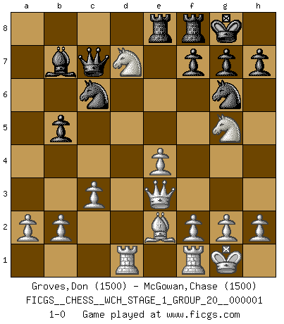 Last move : 1-0 2006 August 15 17:53:45 [Event "FICGS__CHESS__WCH_STAGE_1_GROUP_20__000001"] [Site "FICGS"] [Date "2006.08.04"] [Round "1"] [White "Groves,Don"] [Black "McGowan,Chase"] [Result "1-0"] [WhiteElo "1500"] [BlackElo "1500"] 1.e4 e5 2.Nf3 Nc6 3.d4 exd4 4.Nxd4 Bc5 5.Be3 Qf6 6.c3 Nge7 7.Qd2 O-O 8.Nb5 Bxe3 9.Qxe3 Qe5 10.Nd2 Ng6 11.Nf3 Qe7 12.Nxc7 Rb8 13.Nd5 Qe6 14.Be2 Nce7 15.Qxa7 Nc6 16.Qe3 b5 17.O-O Bb7 18.Ng5 Qd6 19.Rad1 Rbe8 20.Nb6 Qc7 21.Nxd7 1-0 Scotch : Blackburne attack Kingside Castling by player Black (move 7) Kingside Castling by player White (move 17) Player White won this chess game. Follow this game move after move (download)A Chess game is divided into three stages: the first, when you hope you have the advantage, the second when you believe you have an advantage, and the third... when you know you're going to lose ! (Savielly Tartakower) Verschiedene, sehr schätzbare und im Laufe des Lebens nützliche Eigenschaften des Geistes können durch das Schachspiel erworben und gekräftigt werden, so dass sie zu Gewohnheiten werden, die uns nie im Stich lassen. (Benjamin Franklin) En posiciones complicadas, Bobby Fischer pocas veces tuvo que temer de cualquiera. (Paul Keres) Les échecs sont utiles à l'exercice de la faculté de penser et à celle de l'imagination. Car nous devons posséder une méthode élaborée pour atteindre des buts partout où nous devons conduire notre raison. (Leibnitz) Always be a first-rate version of yourself, instead of a second-rate version of somebody else. (Judy Garland)