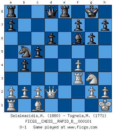 Last move : 0-1 2008 October 20 10:50:41 [Event "FICGS__CHESS__RAPID_B__000101"] [Site "FICGS"] [Date "2008.09.02"] [Round "1"] [White "Selalmazidis,Arsenis"] [Black "Tognela,Matteo"] [Result "0-1"] [WhiteElo "1880"] [BlackElo "1771"] 1.e4 d6 2.d4 Nf6 3.Nc3 g6 4.f4 Bg7 5.Nf3 O-O 6.Be2 c5 7.d5 e6 8.O-O exd5 9.exd5 Na6 10.Nd2 Nc7 11.Bf3 b5 12.Nde4 Re8 13.Nxf6+ Bxf6 14.Ne2 Bb7 15.Ng3 b4 16.Qd2 Bxd5 17.Kh1 Bxf3 18.Rxf3 Nb5 0-1 Pirc : Austrian attack Kingside Castling by player Black (move 5) Kingside Castling by player White (move 8) Player Black won this chess game. Follow this game move after move (download)Winning isn't everything... but losing is nothing. (Mednis) Herr Iljumschinow ist ein etwas merkwürdiger Geschäftsmann: Er arbeitet zusammen mit Leuten wie Muammar al-Gaddafi; früher ist das Saddam Hussein gewesen. (Joel Lautier) El Ajedrez por encima de todo... ¡es una pelea!. (Emanuel Lasker) Je ne crois pas en la psychologie, je crois aux bons coups. (Robert Fischer) All battles are fought by scared men who'd rather be someplace else. (John Wayne in the movie In harm's way)