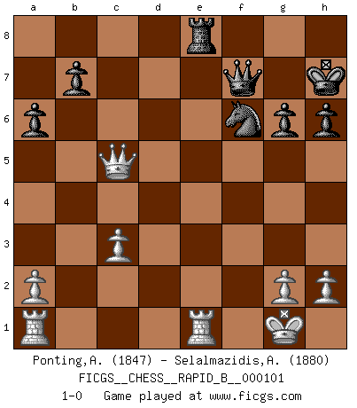 Last move : 1-0 2008 November 11 15:59:11 [Event "FICGS__CHESS__RAPID_B__000101"] [Site "FICGS"] [Date "2008.09.02"] [Round "1"] [White "Ponting,Andrew"] [Black "Selalmazidis,Arsenis"] [Result "1-0"] [WhiteElo "1847"] [BlackElo "1880"] 1.d4 Nf6 2.c4 c5 3.d5 e6 4.Nc3 exd5 5.cxd5 d6 6.e4 g6 7.f4 Bg7 8.Bb5+ Bd7 9.e5 dxe5 10.fxe5 Qe7 11.Nf3 O-O 12.Bg5 h6 13.Bxf6 Bxf6 14.O-O Bg7 15.Re1 a6 16.Bxd7 Nxd7 17.e6 fxe6 18.dxe6 Bxc3 19.bxc3 Nf6 20.Ne5 Kh7 21.Qd3 Rg8 22.Nf7 Rg7 23.Qd2 Rxf7 24.exf7 Qxf7 25.Qd6 Re8 26.Qxc5 1-0 Benoni : pawn storm variation Kingside Castling by player Black (move 11) Kingside Castling by player White (move 14) Player White won this chess game. Follow this game move after move (download)Tactics flow from a superior position. (Bobby Fischer) Irgendwie scheint mir sonntags früh um 9 Uhr der Killerinstinkt verloren gegangen zu sein. (Alexej Shirov) Un Peón pasado aumenta su poder a medida de que el número de piezas en el tablero disminuye. (Capablanca) Même si l'adversaire joue le coup analysé précédemment, recommencez l'analyse en voyant la nouvelle position. Première règle de Blumenfeld All maxims have their antagonist maxims; proverbs should be sold in pairs, a single one being but a half truth. (William Mathews)