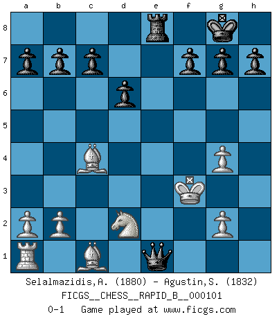 Last move : 0-1 2008 November 10 22:5:41 [Event "FICGS__CHESS__RAPID_B__000101"] [Site "FICGS"] [Date "2008.09.02"] [Round "1"] [White "Selalmazidis,Arsenis"] [Black "Agustin,Santos"] [Result "0-1"] [WhiteElo "1880"] [BlackElo "1832"] 1.e4 e5 2.Nf3 Nc6 3.Bc4 Bc5 4.O-O d6 5.h3 Nf6 6.Re1 O-O 7.c3 Nxe4 8.d4 exd4 9.cxd4 Nxf2 10.Kxf2 Nxd4 11.Nxd4 Qh4+ 12.Kf1 Bxd4 13.Qf3 Bg4 14.hxg4 Qh1+ 15.Ke2 Rae8+ 16.Kd3 Rxe1 17.Nd2 Re3+ 18.Qxe3 Bxe3 19.Kxe3 Re8+ 20.Kf3 Qe1 0-1 Giuoco Piano Kingside Castling by player White (move 4) Kingside Castling by player Black (move 6) Player Black won this chess game. Follow this game move after move (download)Many Chess players were surprised when after the game, Fischer quietly explained: 'I had already analyzed this possibility' in a position which I thought was not possible to foresee from the opening. (Mikhail Tal) Der vorletzte Fehler gewinnt. (Savielly Grigorievitsch Tartakower) Aquel que toma al Peón de Caballo de la Reina, se pasará la noche a dormir en la calle. (Anónimo) Je crois qu'il existe des manières très spécifiques de jouer efficacement contre une machine. Evidemment, nous n'avons aucune chance en technique pure, parce que l'ordinateur calcule de manière parfaite. Mais lorsque nous faisons appel à notre cerveau, en utilisant l'intuition et la compréhension, alors nous restons beaucoup plus forts. (Anatoli Karpov) Statistics can be made to prove anything - even the truth. (Author unknown)