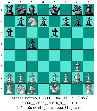 Last move : 1-0 2008 September 22 23:54:59 [Event "FICGS__CHESS__RAPID_B__000101"] [Site "FICGS"] [Date "2008.09.02"] [Round "1"] [White "Tognela,Matteo"] [Black "Harris,Cal"] [Result "1-0"] [WhiteElo "1771"] [BlackElo "1455"] 1.Nf3 e6 2.g3 Qf6 3.Bg2 Bc5 4.d4 Bxd4 5.Qxd4 Qxd4 6.Nxd4 c5 7.Nb5 a6 8.Nc7+ 1-0 Reti Opening Player White won this chess game. Follow this game move after move (download)The stomach is an essential part of the Chess master. (Bent Larsen) Über Karpov: Er war und ist ein Vertreter der russischen Reaktionäre. Das steckt tief in seiner Seele, wehalb ich nicht nett mit ihm umgehen kann. (Viktor Kortschnoi) Por tratar de evitar la pérdida de una pieza, muchas personas han perdido una partida de Ajedrez. (Savielly Tartakover) C'est une question de caractère, Beaucoup de gens perdent leur motivation très vite. D'autres, ils sont rares, peuvent la conserver très longtemps. J'aime les échecs, encore aujourd'hui je suis heureux d'analyser des parties. J'aime toujours gagner, je déteste encore perdre. Bien jouer est important pour mon intégrité intellectuelle et morale. Et puis les échecs vivent en ce moment une période historique grâce à Internet. Ils se développent dans les systèmes éducatifs à travers le monde. Ils sortent de leur ghetto, et c'est mon rôle de mener à bien cette révolution. (Gary Kasparov) The human is the only animal species whose members are able to talk themselves into difficulties that would not otherwise exist. (Wendell Johnson)