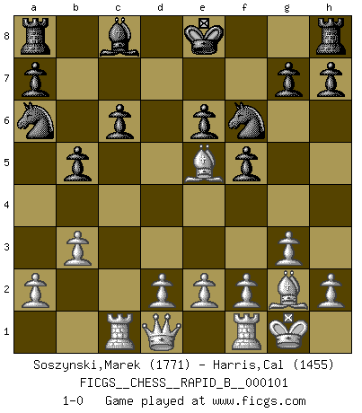 Last move : 1-0 2008 October 16 11:34:4 [Event "FICGS__CHESS__RAPID_B__000101"] [Site "FICGS"] [Date "2008.09.02"] [Round "1"] [White "Soszynski,Marek"] [Black "Harris,Cal"] [Result "1-0"] [WhiteElo "1771"] [BlackElo "1455"] 1.g3 d5 2.Nf3 f5 3.c4 dxc4 4.Na3 c6 5.Nxc4 b5 6.Nce5 e6 7.Bg2 Qd5 8.b3 Nf6 9.O-O Bd6 10.Bb2 Na6 11.Rc1 Bxe5 12.Nxe5 Qxe5 13.Bxe5 1-0 This chess game has been lost on time (started : 2008.09.02 16:10:42) Benko's Opening Kingside Castling by player White (move 9) Player White won this chess game. Follow this game move after move (download)The enormous mental resilience, without which no Chess player can exist, was so much taken up by Chess that he could never free his mind of this game. (Albert Einstein) Bis zum Jahr 1971 verlief in meiner Schachkariere alles glatt. Dieses dramatische Match [Fischer-Taimanov 6:0] machte mein Leben zur Hölle. (Mark Taimanov) El ganar no lo es todo... pero el perder es nada. (Mednis) Votre seul travail dans les ouvertures est d'obtenir un milieu de partie jouable. (Lajos Portish) There is a computer disease that anybody who works with computers knows about. It's a very serious disease and it interferes completely with the work. The trouble with computers is that you 'play' with them ! (Richard P. Feynman)
