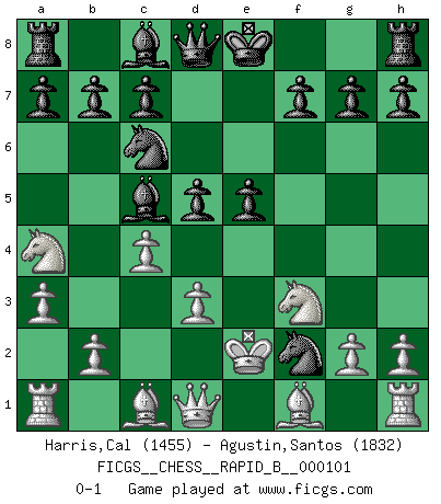 Last move : 0-1 2008 October 5 21:19:36 [Event "FICGS__CHESS__RAPID_B__000101"] [Site "FICGS"] [Date "2008.09.02"] [Round "1"] [White "Harris,Cal"] [Black "Agustin,Santos"] [Result "0-1"] [WhiteElo "1455"] [BlackElo "1832"] 1.e4 e5 2.c4 Nf6 3.Nc3 Nc6 4.Nf3 Bb4 5.Na4 Nxe4 6.Ke2 d5 7.a3 Bc5 8.d3 Nxf2 0-1 King's pawn game Player Black won this chess game. Follow this game move after move (download)Kasparov : J'adoube , Ivanchuk : S'il vous plaît ! (Garry Kasparov & Vassily Ivanchuk, Linares 1997) Schach ist mein Leben, meine Leidenschaft, was ich gelernt habe und seit meinem 14. Lebensjahr profimässig praktiziere. Darauf zu verzichten, würde mir sehr schwer fallen. (Viktor Kortschnoi) El Ajedrez es una hermosa aventura. (Bent Larsen) Les échecs c'est le défi de l'alpiniste, toujours plus haut, prêt à tout pour monter à l'assaut du Roi ennemi. Les échecs, c'est de la musique en mouvement, un ballet majestueux pour les yeux. C'est de la poésie composée par les fantômes du passé qui au même titre que Rimbaud ou Verlaine méritent notre admiration. Les échecs, c'est de la peinture ou le moindre mouvement modifie le tableau pour en faire un Picasso ou un Van Gogh. Les échecs, c'est tout et rien, c'est la vie et la mort. Jjulie33 sur le forum de France-Echecs. To err is human, to shift the blame on someone else is tactical. (Mladen Jankovic)
