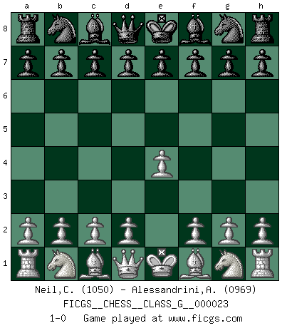 Last move : 1-0 2008 October 13 11:21:42 [Event "FICGS__CHESS__CLASS_G__000023"] [Site "FICGS"] [Date "2008.09.02"] [Round "1"] [White "Neil,Charlie"] [Black "Alessandrini,Alfredo"] [Result "1-0"] [WhiteElo "1050"] [BlackElo "0969"] 1.e4 1-0 This chess game has been lost on time (started : 2008.09.02 22:46:13) King's pawn Opening Player White won this chess game. Follow this game move after move (download)When your house is on fire, you can't be bothered with the neighbors. Or, as we say in Chess, if your King is under attack you don't worry about losing a Pawn on the Queen's side. (Gary Kasparov) Wer nie einen Fehler gemacht hat, hat nie etwas Neues ausprobiert. (Albert Einstein) Un jugador que trata de regresar una movida en el Ajedrez es un futuro carterista. (Richard Fenton) Le pion, dans sa simplicité, marche droit devant lui, mais lorsqu'il prend, il le fait obliquement? Ainsi l'homme, tant qu'il reste pauvre, marche dans la droiture et vit honnêtement, mais lorsqu'il recherche les honneurs, il flatte, se parjure et, par les voies obliques, cherche une position supérieure sur l'échiquier du monde. (Jean de Galles) Art disturbs, science reassures. (Georges Braque, Le Jour et la Nuit)