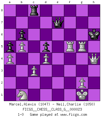 Last move : 1-0 2008 September 21 0:16:23 [Event "FICGS__CHESS__CLASS_G__000023"] [Site "FICGS"] [Date "2008.09.02"] [Round "1"] [White "Marcel,Alexis"] [Black "Neil,Charlie"] [Result "1-0"] [WhiteElo "1047"] [BlackElo "1050"] 1.f4 c5 2.Nf3 Nc6 3.e3 d6 4.Be2 e6 5.b3 Nf6 6.Bb2 Be7 7.O-O Bd7 8.h3 h6 9.d3 Nh5 10.Qe1 Bf6 11.Bxf6 Nxf6 12.Nbd2 d5 13.Qg3 e5 14.fxe5 Nh5 15.Qh2 O-O 16.a3 Be6 17.Rf2 Rc8 18.Raf1 g5 19.c3 Qc7 20.d4 cxd4 21.exd4 Qe7 22.b4 Nf4 23.a4 a5 24.b5 Nxe2+ 25.Rxe2 Nd8 26.Nb1 b6 27.Qg3 f5 28.exf6 Rxf6 29.Ref2 Nf7 30.Nxg5 Nxg5 31.Rxf6 Bxh3 32.Rxh6 Bf5 33.Rxf5 Kg7 34.Rh5 Kg6 35.Rhxg5+ Kh6 36.Qh4+ 1-0 Bird's Opening Kingside Castling by player White (move 7) Kingside Castling by player Black (move 15) Player White won this chess game. Follow this game move after move (download)Chess is a sea in which a gnat may drink and an elephant may bathe. (Hindu proverb) Ich möchte Schüler heranbilden, die das Vermögen haben, selbst zu denken und Kritik zu üben. (Emanuel Lasker) El Rey es una pieza de pelea. ¡Usenlo!. (Wilhelm Steinitz) Il (Jacob Murray) ne joue pas pour le bon coup, mais pour le meilleur. (Eloi Relange) Players are not good because they find tactics, it is about the way to find the positions in which those tactics are hidden. (Luc-Olivier Leclerc)