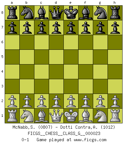Last move : 0-1 2008 September 3 3:53:58 [Event "FICGS__CHESS__CLASS_G__000023"] [Site "FICGS"] [Date "2008.09.02"] [Round "1"] [White "McNabb,Sean"] [Black "Dotti Contra,Alessandro"] [Result "0-1"] [WhiteElo "0807"] [BlackElo "1012"] 0-1 Player Black won this chess game. Follow this game move after move (download)Pawns are born free, yet they are everywhere in chains. (Rick Kennedy) Vom Schach wurde gesagt das Leben sei dafür nicht lange genug. Aber das ist der Fehler des Lebens, nicht des Schach'. (Irving Chernev) No es una movida, aún la mejor movida que tu debas buscar, sino un plan comprensible. (Eugene Znosko-Borovsky) Nous sommes les pions de la mystérieuse partie d'Echecs jouée par Dieu. Il nous déplace, nous arrête, nous pousse encore, puis nous lance un à un dans la boîte du Néant. Epitaphe sur la tombe de David Janowsky (1868-1927). I don't diet. I just don't eat as much as I'd like to. (Linda Evangelista, supermodel)