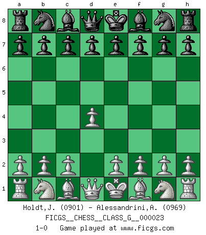 Last move : 1-0 2008 October 13 11:21:42 [Event "FICGS__CHESS__CLASS_G__000023"] [Site "FICGS"] [Date "2008.09.02"] [Round "1"] [White "Holdt,Jonas"] [Black "Alessandrini,Alfredo"] [Result "1-0"] [WhiteElo "0901"] [BlackElo "0969"] 1.d4 1-0 This chess game has been lost on time (started : 2008.09.02 22:46:13) Queen's pawn Player White won this chess game. Follow this game move after move (download)The hardest game to win is a won game. (Emanuel Lasker) Privat ist Kortschnoi kein schlechter Mensch, sehr sympathisch. Aber während des Spiels ist er grausam. Er will dich töten. (Miguel Najdorf) Si tu oponente no puede hacer nada activo, entonces no apures la posición; En vez de eso, dejalo estar sentado ahí, sufriendo y rogandote por un empate. (Jeremy Silman) Les échecs sont un jeu terrible. Si vous n'avez pas le centre, votre adversaire a une position plus libre. Par contre, si vous avez le centre, alors vous avez vraiment quelque chose pour laquelle vous inquiéter ! (Siegbert Tarrasch) Without enthusiasm, virtue functions not at all, and vice only poorly. (Mignon McLaughlin, The Neurotic's Notebook, 1960)