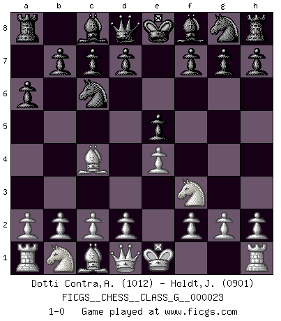 Last move : 1-0 2008 October 23 0:34:17 [Event "FICGS__CHESS__CLASS_G__000023"] [Site "FICGS"] [Date "2008.09.02"] [Round "1"] [White "Dotti Contra,Alessandro"] [Black "Holdt,Jonas"] [Result "1-0"] [WhiteElo "1012"] [BlackElo "0901"] 1.e4 e5 2.Nf3 Nc6 3.Bb5 a6 4.Bc4 1-0 This chess game has been lost on time (started : 2008.09.02 22:46:13) Ruy Lopez (Spanish Opening) Player White won this chess game. Follow this game move after move (download)Chess is like war on a board. (Bobby Fischer) Das Schachspiel ist ein See, in welchem eine Mücke baden und ein Elefant ertrinken kann. (Emanuel Lasker) El juego del Ajedrez no es solamente una diversión quieta; algunas cualidades muy valuables de la mente se pueden adquirir y cultivar con el, como convertirlos en habitos disponibles para toda ocasión; ya que la vida es algo así como el Ajedrez. (Benjamin Franklin) C'est une question de caractère, Beaucoup de gens perdent leur motivation très vite. D'autres, ils sont rares, peuvent la conserver très longtemps. J'aime les échecs, encore aujourd'hui je suis heureux d'analyser des parties. J'aime toujours gagner, je déteste encore perdre. Bien jouer est important pour mon intégrité intellectuelle et morale. Et puis les échecs vivent en ce moment une période historique grâce à Internet. Ils se développent dans les systèmes éducatifs à travers le monde. Ils sortent de leur ghetto, et c'est mon rôle de mener à bien cette révolution. (Gary Kasparov) You can't play chess if you're groggy from pills. (Anatoly Karpov)