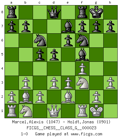 Last move : 1-0 2008 October 13 11:21:42 [Event "FICGS__CHESS__CLASS_G__000023"] [Site "FICGS"] [Date "2008.09.02"] [Round "1"] [White "Marcel,Alexis"] [Black "Holdt,Jonas"] [Result "1-0"] [WhiteElo "1047"] [BlackElo "0901"] 1.f4 d5 2.Nf3 c5 3.e3 Nc6 4.Be2 Bf5 5.O-O e6 6.b3 Nf6 7.Bb2 Be7 8.h3 O-O 9.d3 1-0 This chess game has been lost on time (started : 2008.09.02 22:46:13) Bird's Opening Kingside Castling by player White (move 5) Kingside Castling by player Black (move 8) Player White won this chess game. Follow this game move after move (download)Morphy was probably the greatest genius of them all. (Bobby Fischer) Ich las kürzlich ein Buch von Nietzsche. Er sagte Religion verdumme nur die Menschen. Ich stimme zu. (Robert James Fischer) Cuando tu no sabes absolutamente que mas hacer, es tiempo de entrar en pánico. (John van der Wiel) J'apprécie les joueurs d'est-indienne, c'est grâce à eux que je nourris ma famille depuis tant d'années. (Petrosian) There are more things in heaven and earth than practically anywhere else. (Unknown)