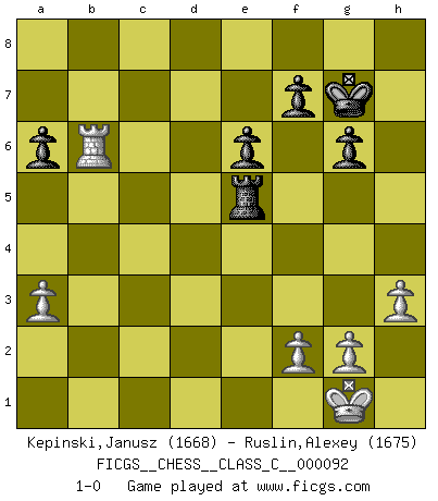 Last move : 1-0 2009 March 17 23:10:13 [Event "FICGS__CHESS__CLASS_C__000092"] [Site "FICGS"] [Date "2008.09.02"] [Round "1"] [White "Kepinski,Janusz"] [Black "Ruslin,Alexey"] [Result "1-0"] [WhiteElo "1668"] [BlackElo "1675"] 1.d4 b6 2.e4 Bb7 3.Nc3 e6 4.a3 g6 5.Nf3 Bg7 6.Be3 Ne7 7.Be2 O-O 8.O-O d5 9.e5 Nd7 10.Rc1 c5 11.Bg5 cxd4 12.Qxd4 Rc8 13.Bxe7 Qxe7 14.Rfe1 Qc5 15.Qxc5 Nxc5 16.Rcd1 a6 17.h3 Rfd8 18.Bd3 d4 19.Ne4 Nxe4 20.Bxe4 Bxe4 21.Rxe4 Rxc2 22.Rexd4 Rxd4 23.Rxd4 Rxb2 24.Rd8+ Bf8 25.Ng5 Re2 26.Nxh7 Kxh7 27.Rxf8 Kg7 28.Rb8 Rxe5 29.Rxb6 1-0 Queen's pawn : English defense Kingside Castling by player Black (move 7) Kingside Castling by player White (move 8) Player White won this chess game. Follow this game move after move (download)There are two classes of men; those who are content to yield to circumstances and who play whist; those who aim to control circumstances, and who play Chess. (Mortimer Collins) Strategie ist, wie man ein Mädchen auf den Rücksitz bekommt. Taktik ist, was man tut, wenn man dann dort ist. (Anonymous) Aquellos que dicen entender al Ajedrez, no entienden nada. (Robert Hubner) Les sacrifices démontrent seulement que quelqu'un a gaffé. (Savielly Tartacover) Employ the attack like tactic of defense. (Chinese proverb)