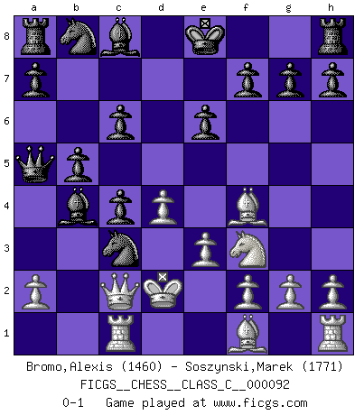 Last move : 0-1 2008 September 4 10:22:34 [Event "FICGS__CHESS__CLASS_C__000092"] [Site "FICGS"] [Date "2008.09.02"] [Round "1"] [White "Bromo,Alexis"] [Black "Soszynski,Marek"] [Result "0-1"] [WhiteElo "1460"] [BlackElo "1771"] 1.d4 d5 2.c4 e6 3.Nf3 Nf6 4.Nc3 c6 5.Bf4 dxc4 6.e3 b5 7.b4 Bxb4 8.Qc2 Qa5 9.Rc1 Nd5 10.Kd2 Nxc3 0-1 Queen's gambit declined Player Black won this chess game. Follow this game move after move (download)Chess is 99 percent tactics. (Teichmann) Dieses schreckliche Gefühl, dass ich gegen eine Maschine spielte, die niemals Fehler macht, zerschmetterte meinen Widerstand. (Mark Taimanov) Observen a Garry Kasparov. Después de una derrota, invariablemente el gana la próxima partida. Prácticamente hace pedazos a su siguiente oponente. Eso es algo que tenemos que aprender a lograr. (Maurice Ashley) On croit qu'il y a plus de mauvais joueurs que de bons joueurs, c'est faux : Il y a autant de joueurs qui gagnent que de joueurs qui perdent. (Philippe Geluck) Strategy without tactics is the slowest route to victory. Tactics without strategy is the noise before defeat. (Sun Tzu)