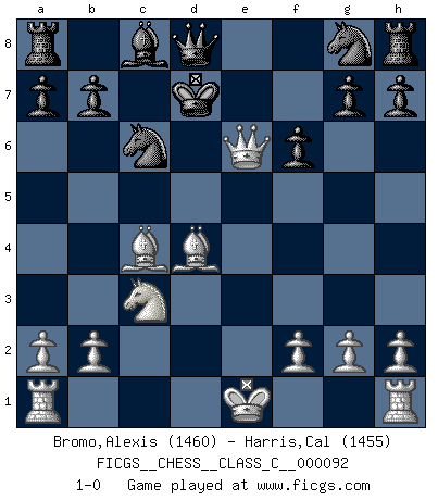 Last move : 1-0 2008 December 12 2:17:22 [Event "FICGS__CHESS__CLASS_C__000092"] [Site "FICGS"] [Date "2008.09.02"] [Round "1"] [White "Bromo,Alexis"] [Black "Harris,Cal"] [Result "1-0"] [WhiteElo "1460"] [BlackElo "1455"] 1.d4 d5 2.c4 dxc4 3.Nc3 e5 4.e3 exd4 5.exd4 c5 6.Nf3 cxd4 7.Nxd4 Bc5 8.Be3 Bxd4 9.Bxd4 f6 10.Bxc4 Nc6 11.Qe2+ Kd7 12.Qe6+ 1-0 This chess game has been lost on time (started : 2008.09.02 23:40:49) Queen's gambit accepted Player White won this chess game. Follow this game move after move (download)The older I grow, the more I value Pawns. (Keres) Ich würde die 30 stärksten Spieler der USA im Simultanspiel besiegen. (José Raúl Capablanca) Un mal plan es mejor que no tener ningún plan. (Frank Marshall) A ce moment-là , je menaçais de comprendre la position ! (Clément L'Heureux) Empty your mind, be formless, shapeless — like water. (Bruce Lee)
