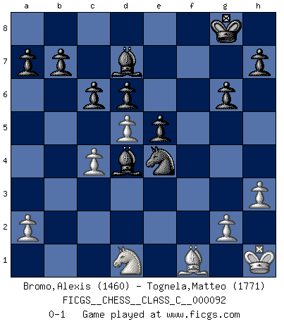 Last move : 0-1 2008 September 12 15:7:8 [Event "FICGS__CHESS__CLASS_C__000092"] [Site "FICGS"] [Date "2008.09.02"] [Round "1"] [White "Bromo,Alexis"] [Black "Tognela,Matteo"] [Result "0-1"] [WhiteElo "1460"] [BlackElo "1771"] 1.d4 Nf6 2.c4 g6 3.Nf3 Bg7 4.Nc3 O-O 5.e4 d6 6.d5 c6 7.Be3 Qa5 8.Bd3 Ng4 9.Bd2 Qb6 10.O-O Qxb2 11.Rc1 Nd7 12.h3 Nc5 13.Be2 Ne5 14.Nxe5 Bxe5 15.Qe1 f5 16.f3 Bd4+ 17.Kh1 e5 18.Rc2 Qxc2 19.Nd1 fxe4 20.Bh6 Bd7 21.Bxf8 Rxf8 22.fxe4 Rxf1+ 23.Bxf1 Qxe4 24.Qxe4 Nxe4 0-1 King's Indian, 3.Nf3 Kingside Castling by player Black (move 4) Kingside Castling by player White (move 10) Player Black won this chess game. Follow this game move after move (download)Chess is ruthless: you've got to be prepared to kill people. (Nigel Short) Es genügt nicht ein guter Spieler zu sein, man muß auch gut spielen. (Siegbert Tarrasch) El Ajedrez es un invernadero donde los frutos del carácter pueden madurar mas completamente que en la vida. (Edward Morgan Foster) Les échecs sont un jeu terrible. Si vous n'avez pas le centre, votre adversaire a une position plus libre. Par contre, si vous avez le centre, alors vous avez vraiment quelque chose pour laquelle vous inquiéter ! (Siegbert Tarrasch) All the troubles of the world come from being unable to sit alone in a quiet room. (Blaise Pascal)