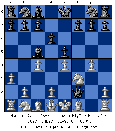 Last move : 0-1 2008 September 23 0:18:42 [Event "FICGS__CHESS__CLASS_C__000092"] [Site "FICGS"] [Date "2008.09.02"] [Round "1"] [White "Harris,Cal"] [Black "Soszynski,Marek"] [Result "0-1"] [WhiteElo "1455"] [BlackElo "1771"] 1.e4 e5 2.c4 Bc5 3.a3 d6 4.g4 Qh4 5.Nf3 Qxf2+ 0-1 King's pawn game Player Black won this chess game. Follow this game move after move (download)Play the opening like a book, the middle game like a magician, and the endgame like a machine. (Spielmann) Alle Schachspieler sollten auch ein Hobby haben. (Savielly Grigorievitsch Tartakower) Cuando tu casa esta en llamas, no puedes ser molestado por tus vecinos. O, como decinos en Ajedrez, si tu Rey esta bajo ataque, no te preocupa perder un Peón del lado de la Reina. (Gary Kasparov) Si je n'étais pas joueur d'échecs, je serais le meilleur dans quelque chose d'autre. (Anatoli Karpov) I'm extremely disappointed. I send you out for exciting, new designer drugs, you come back with tomato sauce. (Gregory House, House M.D.)