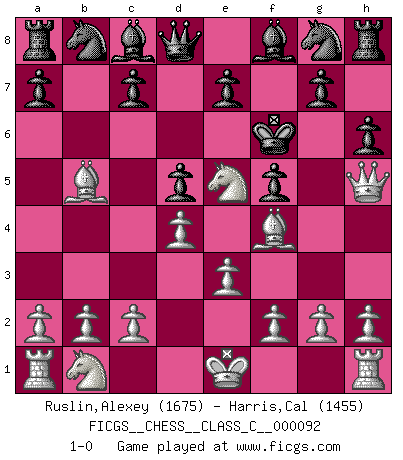 Last move : 1-0 2008 September 24 23:41:21 [Event "FICGS__CHESS__CLASS_C__000092"] [Site "FICGS"] [Date "2008.09.02"] [Round "1"] [White "Ruslin,Alexey"] [Black "Harris,Cal"] [Result "1-0"] [WhiteElo "1675"] [BlackElo "1455"] 1.d4 d5 2.Nf3 f5 3.Bf4 h6 4.e3 b5 5.Bxb5+ Kf7 6.Ne5+ Kf6 7.Qh5 1-0 Queen's pawn game Player White won this chess game. Follow this game move after move (download)Before the endgame, the Gods have placed the middle game. (Siegbert Tarrasch) Um dein Spiel zu verbessern musst du zuallererst das Endspiel studieren, denn diese kann unabhängig studiert werden. Die Eröffnung und das Mittelspiel müssen immer in Bezug gesetzt werden zum Endspiel. (José Raúl Capablanca) Fischer es una tragedia del Ajedrez Americano a la par con Morphy y Pillsbury. (Mig Greengard) La tactique est l'élément le plus important du milieu de jeu. (Siegbert Tarrasch) Ah, beer! The cause of, and the solution to, all of life's problems. (Homer Simpson)
