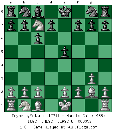 Last move : 1-0 2008 September 23 0:13:3 [Event "FICGS__CHESS__CLASS_C__000092"] [Site "FICGS"] [Date "2008.09.02"] [Round "1"] [White "Tognela,Matteo"] [Black "Harris,Cal"] [Result "1-0"] [WhiteElo "1771"] [BlackElo "1455"] 1.Nf3 e6 2.g3 Bc5 3.Bg2 Qf6 4.d4 Bxd4 5.Qxd4 Qxd4 6.Nxd4 e5 7.Nb5 c6 8.Nc7+ 1-0 Reti Opening Player White won this chess game. Follow this game move after move (download)Every Pawn is a potential Queen. (James Mason) Die Fehler sind da, Sie warten nur darauf gemacht zu werden. (Savielly Grigorievitsch Tartakower) Cuando estes solo, cuando te sientas un extraño en el mundo, juega al Ajedrez. Esto levantará tu espiritu y será tu consejero de guerra. (Aristóteles) Les Echecs sont et restent toujours un combat, un combat intégral comme la boxe, la lutte ou un autre sport, et où il doit y avoir un vainqueur et un vaincu. (Joseph Emil Diemer) A clear conscience is usually the sign of a bad memory. (Unknown)
