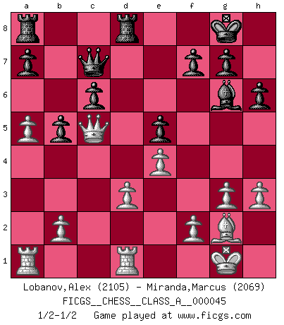 Last move : 1/2-1/2 2008 December 16 13:13:35 [Event "FICGS__CHESS__CLASS_A__000045"] [Site "FICGS"] [Date "2008.09.03"] [Round "1"] [White "Lobanov,Alex"] [Black "Miranda,Marcus"] [Result "1/2-1/2"] [WhiteElo "2105"] [BlackElo "2069"] 1.Nf3 d5 2.g3 Nf6 3.Bg2 c6 4.O-O Bg4 5.d3 Nbd7 6.Nbd2 e5 7.h3 Bh5 8.e4 dxe4 9.Nxe4 Nxe4 10.dxe4 Qc7 11.Be3 Be7 12.Qe2 O-O 13.Qc4 b6 14.a4 h6 15.a5 Bg6 16.Ne1 Bc5 17.Bxc5 Nxc5 18.Nd3 Nxd3 19.cxd3 b5 20.Qc5 Rfd8 21.Rfd1 1/2-1/2 Reti : King's Indian attack, Yugoslav variation Kingside Castling by player White (move 4) Kingside Castling by player Black (move 12) This chess game ended in a draw. Follow this game move after move (download)Don't even mention losing to me. I can't stand to think of it. (Bobby Fischer) Ich hatte meine größten Erfolge, als ich 47 Jahre alt war. Kasparow war noch nicht mal 42 und hat das Schach schon im Stich gelassen. (Viktor Kortschnoi) Cuando no sepas que mover, espera por una idea que se le venga a la la cabeza de tu oponente. Tenlo por seguro de que esa idea estará incorrecta. (Siegbert Tarrasch) Ce qui caractérise les parties de combat, c'est que si le défenseur a constamment de difficiles problèmes à résoudre, l'attaquant doit chercher sans relâche de nouvelles possibilités d'attaque. (Koblentz) True nature is revealed in times of difficulty. (Chinese proverb)