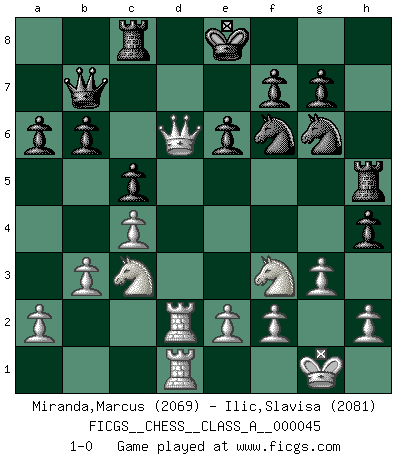 Last move : 1-0 2009 February 22 9:33:50 [Event "FICGS__CHESS__CLASS_A__000045"] [Site "FICGS"] [Date "2008.09.03"] [Round "1"] [White "Miranda,Marcus"] [Black "Ilic,Slavisa"] [Result "1-0"] [WhiteElo "2069"] [BlackElo "2081"] 1.d4 Nf6 2.c4 e6 3.Nf3 b6 4.g3 Bb7 5.Bg2 c5 6.O-O cxd4 7.Qxd4 Nc6 8.Qf4 Ne7 9.b3 Ng6 10.Qd2 Bc5 11.Bb2 h5 12.Bd4 Qe7 13.Nc3 Bc6 14.Ng5 Bxg2 15.Kxg2 h4 16.Rad1 d6 17.Bxc5 dxc5 18.Nf3 a6 19.Qd6 Qb7 20.Kg1 Rc8 21.Rd2 Rh5 22.Rfd1 1-0 This chess game has been lost on time (started : 2008.09.03 8:12:34) Queen's Indian : 4.g3 Bb7 Kingside Castling by player White (move 6) Player White won this chess game. Follow this game move after move (download)Later, I began to succeed in decisive games. Perhaps because I realized a very simple truth: not only was I worried, but also my opponent. (Mikhail Tal) Es liegt in der Natur, vernüftig zu denken und unlogisch zu handeln. (Anatole France) El Ajedrez es un invernadero donde los frutos del carácter pueden madurar mas completamente que en la vida. (Edward Morgan Foster) Si rien de grave n'est détecté lors de l'analyse d'une position, on joue alors le coup. Seconde règle de Blumenfeld. Have no fear of perfection - you'll never reach it. (Salvador Dali)