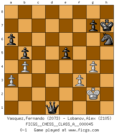 Last move : 0-1 2010 March 18 22:9:24 [Event "FICGS__CHESS__CLASS_A__000045"] [Site "FICGS"] [Date "2008.09.03"] [Round "1"] [White "Vasquez,Fernando"] [Black "Lobanov,Alex"] [Result "0-1"] [WhiteElo "2073"] [BlackElo "2105"] 1.e4 c5 2.d4 cxd4 3.c3 dxc3 4.Nxc3 Nc6 5.Nf3 e6 6.Bc4 d6 7.O-O Be7 8.Qe2 Nf6 9.Rd1 e5 10.h3 O-O 11.Be3 Be6 12.Bxe6 fxe6 13.Rac1 Rc8 14.a3 Qe8 15.Qc2 a6 16.Qb3 Qd7 17.Qa2 Rfe8 18.b4 Bf8 19.Rc2 h6 20.Qb3 Qf7 21.Rcd2 Nb8 22.Rc2 Rc6 23.Rdc1 Rec8 24.Qb1 Nbd7 25.Ne2 Rxc2 26.Rxc2 Qe8 27.Nc3 Rc6 28.Qb3 Kh8 29.Ne2 Nb8 30.Ng3 Qc8 31.Rxc6 Nxc6 32.Qc2 Ne7 33.Qd2 Ng6 34.h4 Kg8 35.h5 Nh8 36.Qd3 b5 37.Qb1 Qc3 38.Bc1 Nf7 39.Bb2 Qc4 40.Nd2 Qc7 41.Nb3 Ng5 42.Bc1 Be7 43.Bd2 Bd8 44.f3 Nf7 45.Kf2 Nd7 46.Ne2 Qc6 47.Be3 Nb6 48.Na5 Qd7 49.Qc2 d5 50.exd5 exd5 51.Qg6 d4 52.Bd2 Qd5 53.Kf1 Qa2 54.Bxh6 Nxh6 55.Qe8+ Kh7 56.Qxd8 Nd5 57.Qg5 Ne3+ 58.Kf2 Qa1 59.Qg6+ Kh8 60.Ng3 Qd1 61.Qe8+ Ng8 62.h6 Qd2+ 63.Ne2 Nd1+ 64.Kf1 Qxh6 65.Ng3 Qd2 66.Kg1 Ne3 67.Qh5+ Nh6 68.Qh3 Qc1+ 69.Kh2 d3 70.Nb3 Qc2 71.Na1 Qa2 72.Ne4 Kh7 73.Ng5+ Kg6 74.Ne4 Nhf5 75.Nb3 Qxb3 76.Ng3 Nh6 77.Ne4 Qa2 78.Qg3+ Kh7 79.Qh3 d2 80.Nf2 Qa1 81.g4 Qe1 82.Qg2 Nxg2 83.Kxg2 d1Q 84.Nxd1 Qxd1 0-1 Sicilian : Smith-Morra gambit Kingside Castling by player White (move 7) Kingside Castling by player Black (move 10) Promotion Queen by player Black (move 83) Player Black won this chess game. Follow this game move after move (download)Let the perfectionist play postal. (Yasser Seirawan) Ich habe die Schachforschung dermaßen betrieben, dass sie auf eine wissenschaftliche Basis gestellt wurde. (Mikhail Moiseyevich Botvinik) El hombre es un frívolo, una creatura engañosa y como un jugador de Ajedrez, se preocupa mas por el proceso de obtener su meta que de la meta por sí misma. (Dostoyevsky) L'action d'une oeuvre littéraire se déroule sur un champ de bataille. Les masques et les types du drame moderne correspondent aux pièces du jeu d'échecs. L'intrigue correspond aux coups et aux gambits, c'est à dire aux techniques du jeu telles qu'utilisées et interprétées par les joueurs. Les tactiques et les péripéties [mouvements] correspondent aux coups exécutés par l'adversaire. (Viktor Shklovsky) There are 10 types of people in this world: those who understand binary and those who don't. (Anonymous)