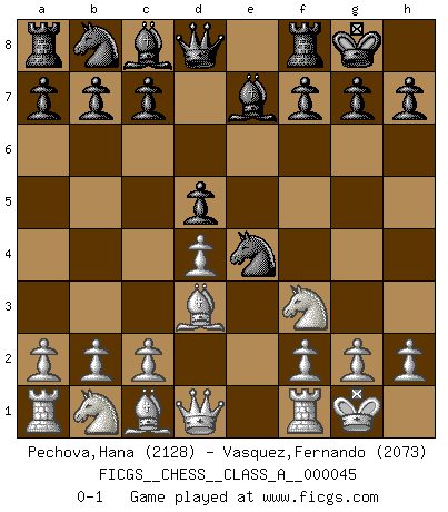 Last move : 0-1 2008 October 21 12:29:13 [Event "FICGS__CHESS__CLASS_A__000045"] [Site "FICGS"] [Date "2008.09.03"] [Round "1"] [White "Pechova,Hana"] [Black "Vasquez,Fernando"] [Result "0-1"] [WhiteElo "2128"] [BlackElo "2073"] 1.e4 e5 2.Nf3 Nf6 3.Nxe5 d6 4.Nf3 Nxe4 5.d4 d5 6.Bd3 Be7 7.O-O O-O 0-1 This chess game has been lost on time (started : 2008.09.03 8:12:34) Petrov : Classical attack, Mason variation Kingside Castling by player White (move 7) Kingside Castling by player Black (move 7) Player Black won this chess game. Follow this game move after move (download)The passed Pawn is a criminal, who should be kept under lock and key. Mild measures, such as police surveillance, are not sufficient. (Aaron Nimzovich) Die Idee von Capablanca, Schach als Fach in den Schulen zu lehren, ist großartig. (Fidel Castro) En la perfecta combinación de Ajedrez como en una historia corta de primera clase, toda la trama y contra trama deberá conducir hacia un final sorprendente, el interes no es mitigado hasta el último momento. (Yates and Winter) A ce moment-là, je menaçais de comprendre la position ! (Clément L'Heureux) The only difference between a tax man and a taxidermist is that the taxidermist leaves the skin. (Mark Twain)