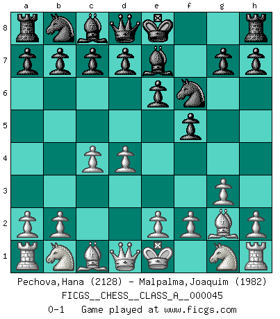 Last move : 0-1 2008 November 25 22:59:42 [Event "FICGS__CHESS__CLASS_A__000045"] [Site "FICGS"] [Date "2008.09.03"] [Round "1"] [White "Pechova,Hana"] [Black "Malpalma,Joaquim"] [Result "0-1"] [WhiteElo "2128"] [BlackElo "1982"] 1.d4 f5 2.c4 e6 3.g3 Nf6 4.Bg2 Be7 0-1 Dutch defense Player Black won this chess game. Follow this game move after move (download)Chess is above all, a fight ! (Emanuel Lasker) Ein Gewinn durch eine ungenaue Kombination, sei sie auch noch so vorzeigbar, erfüllt mich mit Schaudern. (Wilhelm Steinitz) El jugador blanco perdió porque fallo en recordar la coreccta continuación y tuvo que pensar por sí mismo las movidas. (Siegbert Tarrasch) Le thème de l'attaque double intervient d'une manière ou d'une autre dans l'immense majorité des combinaisons. (Youri Averbakh) A good aphorism is too hard for the tooth of time, and is not worn away with the centuries, although it serves as food for every speech. (Friedrich Nietzsche)