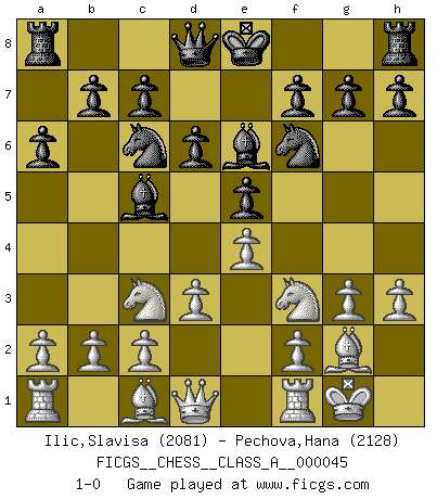Last move : 1-0 2008 November 5 19:51:14 [Event "FICGS__CHESS__CLASS_A__000045"] [Site "FICGS"] [Date "2008.09.03"] [Round "1"] [White "Ilic,Slavisa"] [Black "Pechova,Hana"] [Result "1-0"] [WhiteElo "2081"] [BlackElo "2128"] 1.e4 e5 2.Nf3 Nc6 3.Nc3 Nf6 4.g3 Bc5 5.Bg2 d6 6.d3 a6 7.h3 Be6 8.O-O 1-0 This chess game has been lost on time (started : 2008.09.03 8:12:34) Four knights game Kingside Castling by player White (move 8) Player White won this chess game. Follow this game move after move (download)Whoever sees no other aim in the game than that of giving checkmate to one's opponent will never become a good Chess player. (Euwe) Ich spiele ehrlich und spiele, um zu gewinnen. Wenn ich verliere nehme ich meine Medizin. (Robert James Fischer) Bobby es la celebridad menos entendida y malinterpretada que camina el la faz de esta tierra. (Yasser Seirawan) Des idées, des idées, j'en ai cent, j'en ai mille. Des bonnes, des mauvaises, applicables, irréalisables... Il suffit de faire le tri ! (Roos) For to win one hundred victories in one hundred battles is not the acme of skill. To subdue the enemy without fighting is the acme of skill. (Sun Tzu)