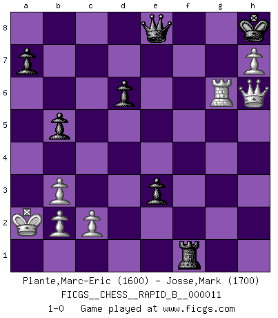 Last move : 1-0 2006 August 19 22:15:1 [Event "FICGS__CHESS__RAPID_B__000011"] [Site "FICGS"] [Date "2006.08.05"] [Round "1"] [White "Plante,Marc-Eric"] [Black "Josse,Mark"] [Result "1-0"] [WhiteElo "1600"] [BlackElo "1700"] 1.e4 c5 2.Nf3 d6 3.d4 cxd4 4.Nxd4 Nf6 5.Nc3 g6 6.Be3 Bg7 7.f3 Nc6 8.Qd2 O-O 9.Bc4 Bd7 10.O-O-O Rb8 11.Bb3 Na5 12.Bh6 Bxh6 13.Qxh6 b5 14.Nd5 e5 15.Nf5 Bxf5 16.exf5 Rc8 17.h4 Rc5 18.h5 Nxb3+ 19.axb3 Nxd5 20.hxg6 Nf6 21.gxh7+ Kh8 22.g4 e4 23.g5 Rxf5 24.Rdg1 Nh5 25.Rxh5 Rxf3 26.R5h1 Qe8 27.Kb1 e3 28.g6 fxg6 29.Rxg6 Rf1+ 30.Rxf1 Rxf1+ 31.Ka2 1-0 Sicilian : Dragon, Yugoslav attack Kingside Castling by player Black (move 8) Queenside Castling by player White (move 10) Player White won this chess game. Follow this game move after move (download)Chess is as much a mystery as women. (Purdy) Eine Person mit durchschnittlichem IQ kann etwa eine ELO von 2000 erreichen. (Jonathan Levitt) En el Ajedrez, tal como es jugado por los Maestros, practicamente la suerte es eliminada. (Emanuel Lasker) Les échecs sont un jeu par leur forme, un art par leur essence et une science par sa difficulté d'acquisition. Ils peuvent vous procurer autant de plaisir qu'un bon livre ou une belle musique, mais vous n'aurez une réelle joie que si vous arrivez à bien jouer. (Tigran Petrosian) He who fights with monsters should be careful lest he thereby become a monster. (Friedrich Nietzsche, Beyond Good and Evil)