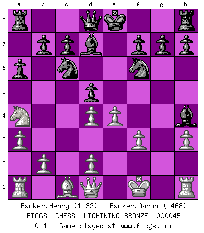 Last move : 0-1 2009 February 14 9:7:46 [Event "FICGS__CHESS__LIGHTNING_BRONZE__000045"] [Site "FICGS"] [Date "2009.02.13"] [Round "1"] [White "Parker,Henry"] [Black "Parker,Aaron"] [Result "0-1"] [WhiteElo "1132"] [BlackElo "1468"] 1.Nc3 Nf6 2.Nb5 a6 3.Nc3 d5 4.e3 Bf5 5.Bd3 Bg4 6.h3 Bd7 7.Nf3 Nc6 8.Na4 e5 9.g3 e4 10.Nh4 exd3 11.cxd3 Bb4 12.d4 Ne4 13.f3 Nf6 14.a3 Bd6 15.e4 Bxg3+ 16.Kf1 Bxh4 0-1 This chess game has been lost on time (started : 2009.02.13 21:14:33) Dunst (Sleipner, Heinrichsen) Opening Player Black won this chess game. Follow this game move after move (download)The laws of Chess do not permit a free choice: you have to move whether you like it or not. (Emanuel Lasker) Moralische Siege zählen nicht. (Savielly Grigorievitsch Tartakower) Cuando me preguntan: -¿Cual es el secreto que te hace hacer mejores movidas que tus oponentes?, Yo respondo: Me da gusto que me pregunten eso, porque, como veran, hay una simple razón. Yo pienso mis propias movidas y dejo a mi oponente que el piense las suyas. (Alexander Alekhine) Les sacrifices démontrent seulement que quelqu'un a gaffé. (Savielly Tartacover) You can't play chess if you're groggy from pills. (Anatoly Karpov)
