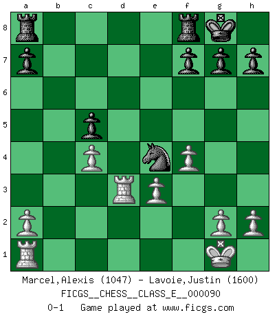 Last move : 0-1 2008 September 21 10:32:14 [Event "FICGS__CHESS__CLASS_E__000090"] [Site "FICGS"] [Date "2008.09.04"] [Round "1"] [White "Marcel,Alexis"] [Black "Lavoie,Justin"] [Result "0-1"] [WhiteElo "1047"] [BlackElo "1600"] 1.f4 d5 2.Nf3 Bg4 3.e3 Bxf3 4.Qxf3 e6 5.Be2 Nf6 6.O-O Be7 7.b3 O-O 8.Bb2 Ne4 9.Qg4 Bf6 10.Bxf6 Qxf6 11.Nc3 Nxd2 12.Nxd5 exd5 13.Rfd1 Qb2 14.c4 dxc4 15.Bxc4 Nxc4 16.bxc4 c5 17.Qf3 Qf6 18.Qxb7 Qc6 19.Qb1 Nd7 20.Qf5 Nf6 21.Rd3 Qe4 22.Qxe4 Nxe4 0-1 Bird's Opening Kingside Castling by player White (move 6) Kingside Castling by player Black (move 7) Player Black won this chess game. Follow this game move after move (download)The essence of Chess is thinking about what Chess is. (David Bronstein) Jeder Schachmeister war einmal ein Anfänger. (Irving Chernev) El poder defensivo de una pieza clavada, solamente es imaginario. (Aaron Nimzovich) Aucun coup ne doit être joué sans but. (Pedro Damiano) A cynic is a man who knows the price of everything but the value of nothing. (Oscar Wilde)