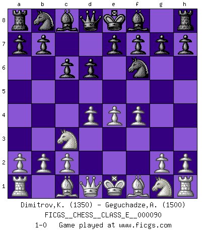 Last move : 1-0 2008 October 23 0:34:17 [Event "FICGS__CHESS__CLASS_E__000090"] [Site "FICGS"] [Date "2008.09.04"] [Round "1"] [White "Dimitrov,Kiril"] [Black "Geguchadze,Alexander"] [Result "1-0"] [WhiteElo "1350"] [BlackElo "1500"] 1.e4 d6 2.d4 Nf6 3.Nc3 c6 4.f4 1-0 This chess game has been lost on time (started : 2008.09.04 10:24:16) Pirc : Ufimtsev-Pytel variation Player White won this chess game. Follow this game move after move (download)You know you're going to lose. Even when I was ahead I knew I was going to lose. - On playing against Fischer. (Andrew Soltis) Privat ist Kortschnoi kein schlechter Mensch, sehr sympathisch. Aber während des Spiels ist er grausam. Er will dich töten. (Miguel Najdorf) ¡Examina movidas que hagan daño! Un buen ojo for movidas desvastantes es mucho mas importante que el conocimiento de principios estratégicos. (Purdy) Même si vous avez un bon coup à faire, regardez toujours s'il n'y en a pas un qui lui soit préférable. (Pedro Damiano) History is the quarrels of popes and kings, with wars or pestilences in every page; the men all so good for nothing, and hardly any women at all. (Jane Austen)