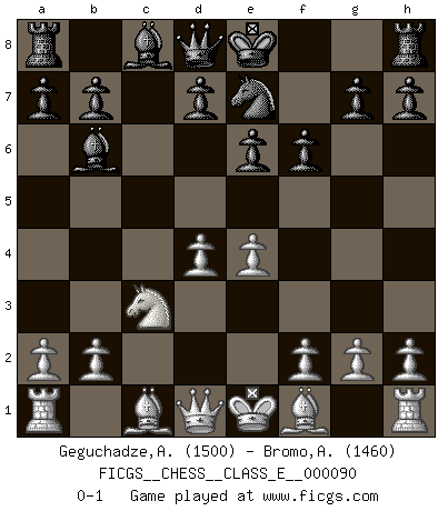 Last move : 0-1 2008 November 1 7:21:29 [Event "FICGS__CHESS__CLASS_E__000090"] [Site "FICGS"] [Date "2008.09.04"] [Round "1"] [White "Geguchadze,Alexander"] [Black "Bromo,Alexis"] [Result "0-1"] [WhiteElo "1500"] [BlackElo "1460"] 1.e4 c5 2.c3 Nc6 3.d4 e6 4.Nf3 f6 5.dxc5 Bxc5 6.Nd4 Nxd4 7.cxd4 Bb6 8.Nc3 Ne7 0-1 This chess game has been lost on time (started : 2008.09.04 10:24:16) Sicilian : Alapin's variation (2.c3) Player Black won this chess game. Follow this game move after move (download)A Chess game is divided into three stages: the first, when you hope you have the advantage, the second when you believe you have an advantage, and the third... when you know you're going to lose ! (Savielly Tartakower) Ich verachte die Medien. (Robert James Fischer) Existen dos clases de sacrificios: los correctos y los míos. (Mikhail Tal) Pour se monter efficace, un Cavalier a besoin d'avant-postes ! Les Cavaliers font les meilleurs bloqueurs de pions passés. The project of the man are lower than those of the sky. (Chinese proverb)