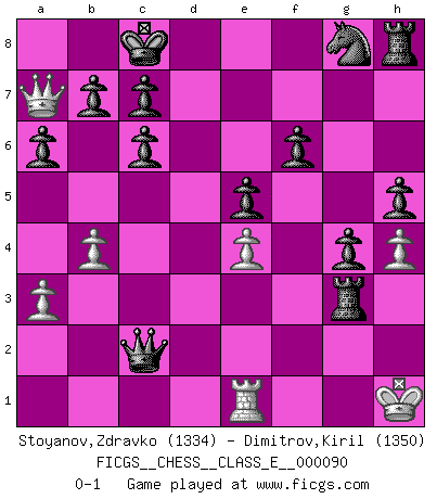 Last move : 0-1 2008 September 26 19:59:29 [Event "FICGS__CHESS__CLASS_E__000090"] [Site "FICGS"] [Date "2008.09.04"] [Round "1"] [White "Stoyanov,Zdravko"] [Black "Dimitrov,Kiril"] [Result "0-1"] [WhiteElo "1334"] [BlackElo "1350"] 1.e4 e5 2.Nf3 Nc6 3.Bb5 a6 4.Bxc6 dxc6 5.h3 f6 6.a3 Be6 7.d3 Bc5 8.O-O Qd6 9.Re1 g5 10.Nh2 O-O-O 11.b4 Bxf2+ 12.Kxf2 Qd4+ 13.Kf1 Qxa1 14.Bd2 h5 15.Qe2 g4 16.c4 Qa2 17.h4 Rxd3 18.Kg1 Rb3 19.Qd1 Rxb1 20.Qe2 Bxc4 21.Qe3 Rb2 22.Nf1 Bxf1 23.Kxf1 Rxd2 24.g3 Qc4+ 25.Kg1 Rd3 26.Qf2 Rf3 27.Qa7 Qc2 28.Kh1 Rxg3 0-1 Comment by player 2 : Kiril Dimitrov : 4i4o tozi hod ot teb sam go nau4il Ruy Lopez : Exchange variation Kingside Castling by player White (move 8) Queenside Castling by player Black (move 10) Player Black won this chess game. Follow this game move after move (download)Good offense and good defense both begin with good development. (Bruce A. Moon) Im Fernschach kannst du während dem Spiel rauchen. (John Christen Knudsen) La partida mas dura de ganar es una partida ganada. (Emanuel Lasker) Assurément je connaissais par expérience le mystérieux attrait de ce jeu royal, le seul entre tous les jeux inventés par les hommes qui échappe souverainement à la tyrannie du hasard, le seul où l'on ne doive sa victoire qu'à son intelligence ou plutôt à une certaine forme d'intelligence. Mais n'est-ce pas déjà le limiter injurieusement que d'appeler les échecs un jeu ? N'est-ce pas une science, un art ou quelque chose qui, comme le cercueil de Mahomet entre ciel et terre, est suspendu entre l'un et l'autre, et qui réunit un nombre incroyable de contraires ? [...] C'est une pensée qui ne mène à rien, une mathématique qui n'établit rien, un art qui ne laisse pas d'uvre, une architecture sans matière; et il l'a prouvé néanmoins qu'il était plus durable, à sa manière, que les livres ou que tout autre monument, ce jeu unique qui appartient à tous les peuples et à tous les temps, et dont personne ne sait quel dieu en fit don à la terre pour tuer l'ennui, pour aiguiser l'esprit et stimuler l'âme. Où commence-t-il, où finit-il ? (Stefan Zweig) Train yourself to let go of everything you fear to lose. (Master Yoda in Star Wars ep.3)