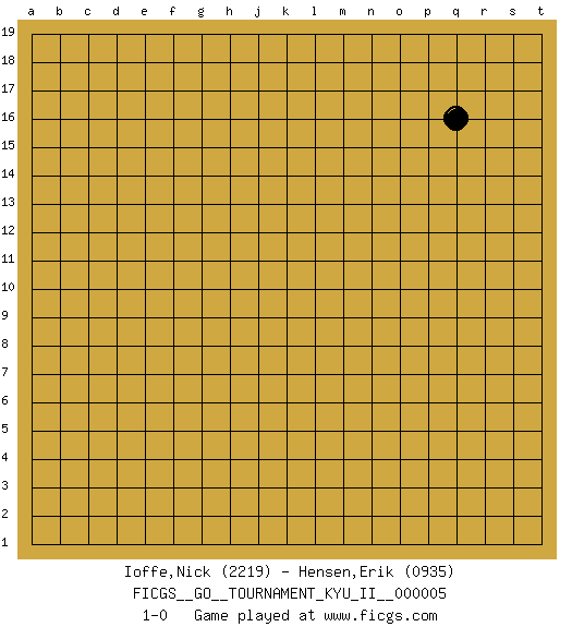 Last move : 1-0 2008 October 4 22:44:16 [Event "FICGS__GO__TOURNAMENT_KYU_II__000005"] [Site "FICGS"] [Date "2008.09.04"] [Round "1"] [Black "Ioffe,Nick"] [White "Hensen,Erik"] [Result "1-0"] [Rating 1 "2219"] [Rating 2 "0935"] 1.q16 1-0 This go game has been lost on time (started : 2008.09.04 18:24:11) Here are the names of the openings (joseki) played in the four corners : Player Black won this Go (weiqi, baduk) game. Follow this game move after move (download)Don't reduce your own liberties. (Bill Taylor) Hold em is to stud what chess is to checkers. (Johnny Moss)