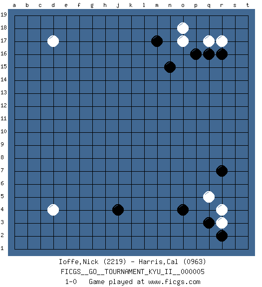 Last move : 1-0 2008 October 17 12:7:5 [Event "FICGS__GO__TOURNAMENT_KYU_II__000005 "] [Site "FICGS"] [Date "2008.09.04"] [Round "1"] [Black "Ioffe,Nick "] [White "Harris,Cal "] [Result "1-0"] [Rating 1 "2219"] [Rating 2 "0963"] 1.q16 d4 2.q3 d17 3.j4 o17 4.m17 r17 5.r16 q17 6.p16 o18 7.n15 q5 8.r7 r3 9.r2 r4 10.o4 1-0 This go game has been lost on time (started : 2008.09.04 18:24:11) Here are the names of the openings (joseki) played in the four corners : Corner d4 : d4 j4Hoshi (Hwajeom, Seongjeom, Xingwei`) 4-4 Point. The star or hoshi (4-4) point, emphasizing influence at the potential expense of territory. Corner q16 : q16 o17Hoshi (Hwajeom, Seongjeom, Xingwei`) 4-4 Point. The star or hoshi (4-4) point, emphasizing influence at the potential expense of territory.Ikken Kakari (Hankan Keolch'im, Yi Gua`jiao~, 1-Space Low Approach). White 2 is the standard approach move to the 4-4. Corner q4 : q3 q5Komoku (Somok, Xiao~mu`) 3-4 Point. The komoku (3-4) point is the traditional corner enclosure move..Ikken Takagakari (Hankan Nop'dakeolch'im, Yi Gaogua`jiao~, 1-Space High Approach). The 5-4 approach move has become more popular in modern times, as modern Go emphasizes speed and influence. Player Black won this Go (weiqi, baduk) game.Follow this game move after move (download ) If there is no stone on the handicap point, the carpenter's square is dead. (Anonymous) Ah, beer! The cause of, and the solution to, all of life's problems. (Homer Simpson)