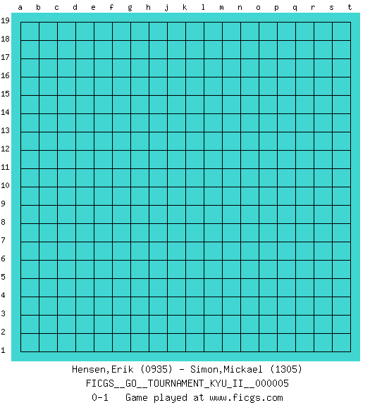 Last move : 0-1 2008 October 4 22:44:16 [Event "FICGS__GO__TOURNAMENT_KYU_II__000005"] [Site "FICGS"] [Date "2008.09.04"] [Round "1"] [Black "Hensen,Erik"] [White "Simon,Mickael"] [Result "0-1"] [Rating 1 "0935"] [Rating 2 "1305"] 0-1 This go game has been lost on time (started : 2008.09.04 18:24:11) Here are the names of the openings (joseki) played in the four corners : Player White won this Go (weiqi, baduk) game. Follow this game move after move (download)Do not make moves that strengthen your opponent ! (Anonymous) May the force be with you. (Han Solo in Star Wars ep.4)