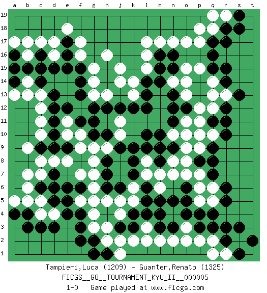 Last move : 1-0 2008 November 23 21:31:25 [Event "FICGS__GO__TOURNAMENT_KYU_II__000005"] [Site "FICGS"] [Date "2008.09.04"] [Round "1"] [Black "Tampieri,Luca"] [White "Guanter,Renato"] [Result "1-0"] [Rating 1 "1209"] [Rating 2 "1325"] 1.q16 d4 2.q4 d17 3.c15 c13 4.e15 f16 5.e16 f17 6.e17 e18 7.f15 h16 8.d12 c12 9.d11 c11 10.d10 c10 11.d9 c8 12.f13 o17 13.r14 q18 14.r17 h13 15.f3 j4 16.c6 d6 17.c3 c4 18.d3 d8 19.c9 b9 20.d5 c5 21.d7 b6 22.e6 c7 23.d6 e8 24.e4 b7 25.b3 b5 26.g11 o3 27.r6 q2 28.r3 h3 29.o5 o15 30.r11 q12 31.r12 q13 32.q11 r13 33.s13 q14 34.r15 p15 35.l4 l3 36.m3 n4 37.k3 l2 38.m4 m2 39.k4 k2 40.n5 h5 41.g2 h2 42.l6 p11 43.q9 o9 44.p8 o8 45.l12 j11 46.l10 l8 47.k9 h9 48.k8 k5 49.l5 l7 50.k7 k6 51.h7 g7 52.h6 g6 53.n11 o11 54.n13 o13 55.l14 l16 56.j6 j5 57.h8 f5 58.e5 g8 59.j9 f10 60.h10 g9 61.f11 j10 62.d13 b16 63.h14 j14 64.h15 j15 65.l9 n7 66.g10 e10 67.j12 g13 68.h12 g15 69.f14 g14 70.m16 m17 71.m15 l17 72.c16 c17 73.r2 m6 74.m5 p7 75.q7 p9 76.q8 p5 77.p4 p6 78.n3 n2 79.p3 p2 80.r18 p17 81.o6 o7 82.b15 b17 83.n12 b14 84.a15 r1 85.s1 q1 86.s3 r19 87.s19 q19 88.s18 k13 89.k12 g3 90.f2 q5 91.r5 n10 92.m10 l15 93.l13 n14 94.m14 k14 95.c14 b13 96.q17 p18 97.e9 f9 98.o12 p12 99.m8 m7 100.a16 a17 101.f4 g4 102.j3 j2 103.o4 o2 104.n16 n17 105.n9 o10 106.n15 o14 107.f6 g5 108.g12 e11 109.e12 d16 110.d15 f7 111.a14 a13 112.a4 a5 113.b4 q10 114.r10 t1 115.t2 q6 116.h1 j1 117.g1 p10 118.q15 n8 119.m9 pass 120.q3 pass 121.pass pass 122.pass 1-0 Here are the names of the openings (joseki) played in the four corners : Corner d16 : d17 c15 Komoku (Somok, Xiao~mu`) 3-4 Point. The komoku (3-4) point is the traditional corner enclosure move.. Ikken Kakari (Hankan Keolch'im, Yi Gua`jiao~, 1-Space Low Pincer). The small knight move is the basic approach move to the 3-4 point stone. It has been continually used for over four centuries. There are limitless variations, with new moves constantly being discovered. Black 2 opens the door to a treaure store of joseki. Corner d4 : d4 d9 Hoshi (Hwajeom, Seongjeom, Xingwei`) 4-4 Point. The star or hoshi (4-4) point, emphasizing influence at the potential expense of territory. Corner q16 : q16 o17 Hoshi (Hwajeom, Seongjeom, Xingwei`) 4-4 Point. The star or hoshi (4-4) point, emphasizing influence at the potential expense of territory. Ikken Kakari (Hankan Keolch'im, Yi Gua`jiao~, 1-Space Low Approach). White 2 is the standard approach move to the 4-4. Corner q4 : q4 o3 Hoshi (Hwajeom, Seongjeom, Xingwei`) 4-4 Point. The star or hoshi (4-4) point, emphasizing influence at the potential expense of territory. Ikken Kakari (Hankan Keolch'im, Yi Gua`jiao~, 1-Space Low Approach). White 2 is the standard approach move to the 4-4. Player Black won this Go (weiqi, baduk) game. Follow this game move after move (download)To invade, need 20 points in open area; otherwise, keshi is best. (Yang Yilun, 7p) Perfection is achieved, not when there is nothing more to add, but when there is nothing left to take away. (Antoine de Saint-Exupéry)
