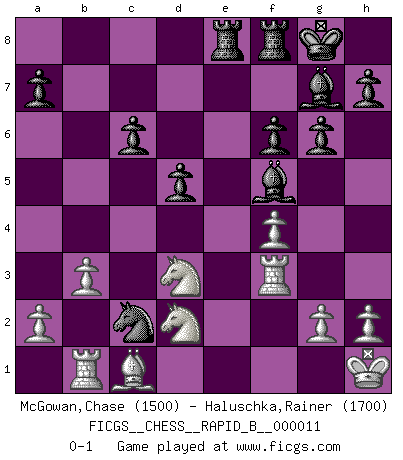 Last move : 0-1 2006 October 15 12:21:12 [Event "FICGS__CHESS__RAPID_B__000011"] [Site "FICGS"] [Date "2006.08.05"] [Round "1"] [White "McGowan,Chase"] [Black "Haluschka,Rainer"] [Result "0-1"] [WhiteElo "1500"] [BlackElo "1700"] 1.e4 c5 2.f4 g6 3.Nf3 Bg7 4.Be2 e6 5.c3 d5 6.exd5 exd5 7.O-O Nc6 8.Kh1 Nge7 9.d4 cxd4 10.cxd4 Nf5 11.Bb5 O-O 12.Bxc6 bxc6 13.Ne5 Qb6 14.b3 Qxd4 15.Qxd4 Nxd4 16.Nd2 f6 17.Nd3 Nc2 18.Rb1 Bf5 19.Rf3 Rae8 0-1 This chess game has been lost on time (started : 2006.08.05 2:34:4) Sicilian : Grand Prix attack Kingside Castling by player White (move 7) Kingside Castling by player Black (move 11) Player Black won this chess game. Follow this game move after move (download)Fischer, who may or may not be mad as a hatter, has every right to be horrified. (Jeremy Silman) Ich glaube nicht an Psychologie, ich glaube an gute Züge. (Robert James Fischer) A través de las casillas del tablero, los Indios explican el movimiento del tiempo y la edad, las influencias mas altas que controlan el mundo y los lazos que vinculan al Ajedrez con el alma humana. (Al-Masudi) La menace est plus forte que l'exécution. (Aaron Nimzovitch) The absolute truth is the thing that makes people laugh. (Carl Reiner)