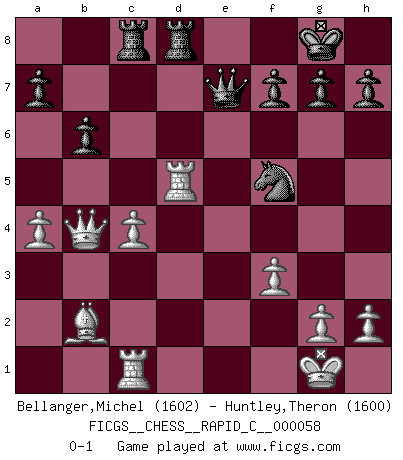 Last move : 0-1 2008 November 18 9:24:24 [Event "FICGS__CHESS__RAPID_C__000058"] [Site "FICGS"] [Date "2008.09.06"] [Round "1"] [White "Bellanger,Michel"] [Black "Huntley,Theron"] [Result "0-1"] [WhiteElo "1602"] [BlackElo "1600"] 1.d4 Nf6 2.c4 e6 3.Nc3 Bb4 4.e3 O-O 5.Bd3 d5 6.Nf3 c5 7.O-O cxd4 8.exd4 dxc4 9.Bxc4 b6 10.Qb3 Bxc3 11.bxc3 Qc7 12.Ne5 Nc6 13.Nxc6 Qxc6 14.f3 Bb7 15.Bd3 Rac8 16.Bb2 Nd5 17.c4 Nf4 18.Be4 Qc7 19.Bxb7 Qxb7 20.Rfe1 Rfd8 21.Re4 Ng6 22.a4 Qc6 23.Rc1 Qd7 24.Qb4 Ne7 25.d5 Nf5 26.Re5 exd5 27.Rxd5 Qe7 0-1 This chess game has been lost on time (started : 2008.09.06 20:49:54) Nimzo-Indian : 4.e3 O-O, 5.Bd3 d5 Kingside Castling by player Black (move 4) Kingside Castling by player White (move 7) Player Black won this chess game. Follow this game move after move (download)A passed Pawn increases in strength as the number of pieces on the board diminishes. (Capablanca) Dass jemand wie Surab Asmaiparaschwili, der selbst Elopunkte gekauft hat , Vize-Präsident der Fide werden konnte, sagt schon einges über den Zustand dieser Organisation aus. (Joel Lautier) Una de estas pequeñas movidas modestas pudieran ser mas molestas a tu oponente que la amenaza mas grande. (Siegbert Tarrasch) Roi des jeux et jeu des rois, les échecs portent en eux un sentiment d'infini. Ils donnent à celui qui s'est efforcé d'en approfondir les arcanes l'impression de n'être pas à la mesure de l'homme; en fait, ils constituent un résumé de l'univers, un microcosme, et figurent cette grande échelle qui, dans les plans de la lumière descend jusqu'à la matière, qui des abîmes insondables remonte jusqu'en l'infini de Dieu. (Pyrame) However beautiful the strategy, you should occasionally look at the results. (Winston Churchill)