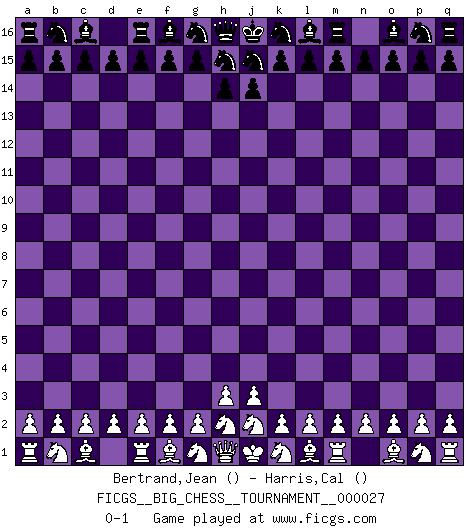 Last move : 0-1 2008 October 6 22:50:32 [Event "FICGS__BIG_CHESS__TOURNAMENT__000027"] [Site "FICGS"] [Date "2008.09.06"] [Round "1"] [White "Bertrand,Jean"] [Black "Harris,Cal"] [Result "0-1"] [WhiteElo ""] [BlackElo ""] 0-1 This big chess game has been lost on time (started : 2008.09.06 22:2:3) Follow this game move after move (download)It began to feel as though you were playing against Chess itself. - On playing against Robert Fischer. (Walter Shipman) Es tut gut, die Entwicklungsperiode von, [...] demokratischem Geist durchdringen zu lassen. Wie undemokratisch wäre es doch beispielsweise, den einen Offizier große Spaziertouren vornehmen zu lassen, während die anderen zu Hause säßen und sich entsetzlich langweilten. (Aaron Nimzowitsch) Dejen al perfeccionista jugar por correo. (Yasser Seirawan) Il s'avisa de me proposer d'apprendre les échecs qu'il jouait un peu... me voilà forcené des échecs. J'achète un échiquier, je m'enferme dans ma chambre, j'y passe des jours et des nuits à vouloir apprendre par cur toutes les parties. (Jean-Jacques Rousseau, Confessions) Indecision is the key to flexibility. (Unknown)