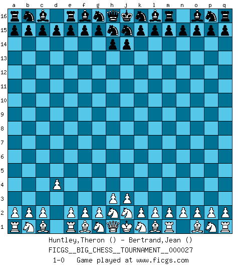 Last move : 1-0 2008 October 7 10:55:8 [Event "FICGS__BIG_CHESS__TOURNAMENT__000027"] [Site "FICGS"] [Date "2008.09.06"] [Round "1"] [White "Huntley,Theron"] [Black "Bertrand,Jean"] [Result "1-0"] [WhiteElo ""] [BlackElo ""] 1.d2-d4 1-0 This big chess game has been lost on time (started : 2008.09.06 22:2:3) Follow this game move after move (download)With or without the title, Bobby Fischer was unquestionably the greatest player of his time. (Burt Hochberg) Ich kenne Menschen, die allen Willen der Welt besitzen und doch nicht Schach spielen können. (Robert James Fischer) Una partida de Ajedrez se divide en 3 etapas: la primera cuando piensas que tienes la ventaja, la segunda cuando crees que tienes la ventaja y la tercera... ¡cuando te das cuenta que vas a perder!. (Savielly Tartakower) Toutes les manuvres exécutées sur une colonne ouverte ont pour but ultime l'intrusion définitive sur la septième ou la huitième rangée, en plein cur de la position ennemie. (Aaron Nimzovitch) Those who make the worst use of their time are the first to complain of its brevity. (Jean de la Bruyere)