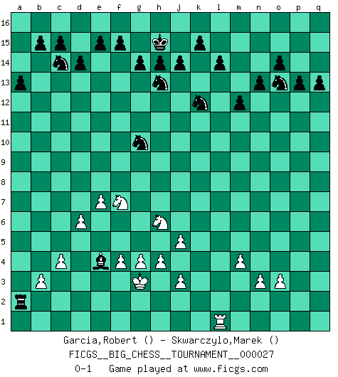 Last move : 0-1 2008 November 6 21:53:7 [Event "FICGS__BIG_CHESS__TOURNAMENT__000027"] [Site "FICGS"] [Date "2008.09.06"] [Round "1"] [White "Garcia,Robert"] [Black "Skwarczylo,Marek"] [Result "0-1"] [WhiteElo ""] [BlackElo ""] 1.d2-d4 n15-n13 2.g2-g4 g15-g14 3.f2-f4 o16-g9 4.n2-n3 h16-a9 5.h1-c6 b16-c14 6.o1-g8 m15-m13 7.e2-e4 p16-n15 8.c6-m6 d15-d14 9.f1-c4 l16-n14 10.m6-j9 o15-o14 11.b1-c3 c16-f13 12.j2-h4 f16-g15 13.e4-e5 g15-e13 14.j9-n9 k16-l14 15.m2-m4 h15-j13 16.l1-m2 a9-d12 17.c1-e3 g9-k6 18.n9-h9 f13-e12 19.h9-p9 p15-p13 20.g1-f3 j15-k13 21.m2-f8 g16-j15 22.p1-n2 j16-h15 23.h2-j4 k6-q12 24.o2-o3 e12-d11 25.e1-d1 d11-g8 26.n2-l3 g8-c4 27.b2-b3 c4-k11 28.c3-b5 m13-m12 29.c2-c4 a15-a13 30.d4-d5 n15-o13 31.j1-h2 a16-a14 32.h4-f5 e13-f12 33.e3-c5 j13-h11 34.f3-g5 a14-b14 35.f8-g9 h11-g9 36.c5-g9 f12-e11 37.g9-e11 d12-e11 38.b5-d6 e16-a16 39.l3-n4 a16-a14 40.l2-l3 b14-b8 41.k1-m2 a14-b14 42.h3-h4 b14-b9 43.p9-n7 m16-a16 44.k2-k4 a16-a14 45.d1-e1 a14-b14 46.e5-e6 q16-a16 47.e6-e7 b9-h9 48.h2-g3 e11-h8 49.m1-h1 k11-n8 50.n4-l5 b14-b9 51.l5-j6 h8-m8 52.n7-f7 m8-f14 53.f7-c10 b9-b10 54.c10-e12 a16-a14 55.e1-e6 h9-h12 56.e12-e9 n14-e6 57.g5-e6 n8-j4 58.e9-g9 b10-h10 59.j6-g5 j4-p10 60.m2-k3 a14-b14 61.d6-f7 b14-b9 62.g9-e11 b9-b11 63.e11-e9 b8-b9 64.e9-e8 b11-j11 65.h1-j1 b9-j9 66.k3-j5 j15-h13 67.e6-f8 l14-k12 68.f8-g10 f14-f9 69.e8-f9 j9-f9 70.g10-h12 k13-h12 71.d5-d6 h12-g10 72.f7-d8 f9-l9 73.j1-l1 h10-l10 74.l3-l4 q12-j5 75.k4-j5 l9-l4 76.l1-j1 l4-l2 77.q1-p1 l2-g2 78.g3-f3 l10-l2 79.g5-e4 j11-k11 80.p1-k1 k11-k1 81.j1-k1 p10-h3 82.e4-f6 l2-p2 83.k1-l1 l15-l14 84.d8-e6 p2-q2 85.e6-g5 h3-p10 86.f6-e4 g2-a2 87.a1-a2 q2-a2 88.g5-f7 q15-q13 89.f5-h6 p10-g2 90.f3-g3 g2-e4 0-1 Follow this game move after move (download)Chess is as much a mystery as women. (Purdy) Über Karpov: Er war und ist ein Vertreter der russischen Reaktionäre. Das steckt tief in seiner Seele, wehalb ich nicht nett mit ihm umgehen kann. (Viktor Kortschnoi) El Ajedrez no es como la vida... ¡tiene reglas!. (Mark Pasternak) Assurément je connaissais par expérience le mystérieux attrait de ce jeu royal, le seul entre tous les jeux inventés par les hommes qui échappe souverainement à la tyrannie du hasard, le seul où l'on ne doive sa victoire qu'à son intelligence ou plutôt à une certaine forme d'intelligence. Mais n'est-ce pas déjà le limiter injurieusement que d'appeler les échecs un jeu ? N'est-ce pas une science, un art ou quelque chose qui, comme le cercueil de Mahomet entre ciel et terre, est suspendu entre l'un et l'autre, et qui réunit un nombre incroyable de contraires ? [...] C'est une pensée qui ne mène à rien, une mathématique qui n'établit rien, un art qui ne laisse pas d'uvre, une architecture sans matière; et il l'a prouvé néanmoins qu'il était plus durable, à sa manière, que les livres ou que tout autre monument, ce jeu unique qui appartient à tous les peuples et à tous les temps, et dont personne ne sait quel dieu en fit don à la terre pour tuer l'ennui, pour aiguiser l'esprit et stimuler l'âme. Où commence-t-il, où finit-il ? (Stefan Zweig) You can think I'm wrong, but that's no reason to quit thinking. (Gregory House, House M.D.)