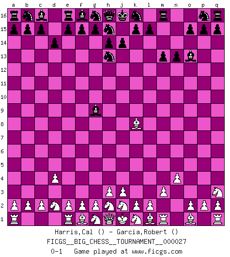 Last move : 0-1 2008 October 21 7:22:58 [Event "FICGS__BIG_CHESS__TOURNAMENT__000027"] [Site "FICGS"] [Date "2008.09.06"] [Round "1"] [White "Harris,Cal"] [Black "Garcia,Robert"] [Result "0-1"] [WhiteElo ""] [BlackElo ""] 1.d2-d4 n15-n13 2.n2-n4 o16-g9 3.p1-q3 m15-m13 4.c1-k8 d15-d14 5.m2-m3 l16-o13 6.b1-d2 j15-h13 0-1 Follow this game move after move (download)Chess is above all, a fight ! (Emanuel Lasker) Ein Kibitz ist einer, der deinem Gegner gute Ratschläge gibt. (Andrew Soltis) Yo nunca en mi vida he jugado la Defensa Francesa, que viene siendo la más aburrida de todas las Aperturas. (Wilhelm Steinitz) Les Echecs représentent une sphère d'idées créatrices basée sur la volonté des deux protagonistes. (Smyslov) A generalist learns less and less about more and more until he knows nothing about everything. (Author unknown)