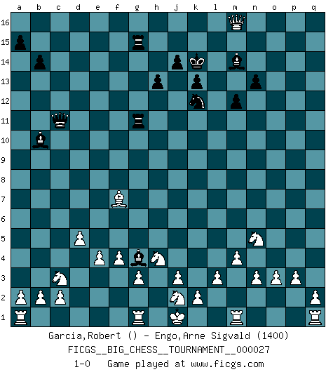 Last move : 1-0 2009 January 12 18:42:54 [Event "FICGS__BIG_CHESS__TOURNAMENT__000027"] [Site "FICGS"] [Date "2008.09.06"] [Round "1"] [White "Garcia,Robert"] [Black "Engo,Arne Sigvald"] [Result "1-0"] [WhiteElo ""] [BlackElo "1400"] 1.d2-d4 k16-l14 2.m2-m4 g16-f14 3.c1-k8 d15-d14 4.g2-g3 l14-j13 5.h1-d5 n15-n14 6.n2-n3 f14-h13 7.e2-e4 m15-m13 8.o1-d11 f15-f13 9.f1-a6 e15-e13 10.l1-m2 g15-g14 11.m2-g7 h15-f14 12.b1-c3 e13-e12 13.d11-a8 k15-k13 14.p1-o3 l15-l13 15.d5-p5 o15-o14 16.g7-c11 b16-d15 17.k8-h10 f16-g15 18.h10-l13 o16-l13 19.p5-p15 p16-n15 20.p15-o14 n15-l14 21.c11-g7 l13-n15 22.o14-q14 q16-p16 23.p2-p3 d15-e13 24.q14-q15 f14-g12 25.f2-f4 g14-g13 26.g1-f3 d14-d13 27.k1-l3 f13-f12 28.l3-j4 h13-j11 29.o3-n5 f12-f11 30.q15-g6 j15-g14 31.g6-k6 j11-h9 32.g7-e5 g12-j11 33.k6-l6 l14-k12 34.h2-g4 g14-h12 35.l6-d6 h12-g10 36.d6-d13 e13-d11 37.a8-d11 e12-d11 38.d13-d11 j16-j15 39.d11-f11 g10-f8 40.e5-c7 h14-h13 41.c7-b8 c16-g12 42.b8-g13 j15-k14 43.f11-a11 g12-o5 44.l2-l3 o5-n4 45.g13-j11 g15-b10 46.a11-b11 b15-b14 47.j11-h12 f8-g10 48.h12-j13 k14-j13 49.o2-o3 e16-e11 50.b11-d13 n4-k7 51.d13-g10 a16-g16 52.g10-d7 k7-g4 53.h3-g4 n14-n13 54.d7-c7 e11-g11 55.c7-c15 g11-g4 56.c15-j9 j13-k14 57.j9-h9 g4-j4 58.e1-g1 l16-p12 59.f3-h4 m13-m12 60.a6-c4 h16-c11 61.c4-f7 g16-g11 62.f7-j4 p12-g4 63.h9-n14 n15-m14 64.j4-f7 p16-p15 65.n14-o14 p15-d15 66.d4-d5 d15-g15 67.o14-m16 1-0 This big chess game has been lost on time (started : 2008.09.06 22:2:3) Follow this game move after move (download)Bobby Fischer is the greatest Chess player who has ever lived. (Ken Smith) Es gibt Leute, die glauben, alles wäre vernünftig, was man mit einem ernsthaften Gesicht tut. (Georg Christoph Lichtenberg) El pensamiento metódico es mas útil en el Ajedrez que la inspiración. (C. J. S. Purdy) Lorsque vous vous retrouvez devant une position atroce, ne tendez pas un ultime piège dérisoire avec l'intention d'abandonner si l'adversaire le déjoue ! Faites-vous plutôt un devoir de résister comme si votre vie en dépendait. Jouez le coup qui vous déplairait au centuple si vous étiez dans la peau de votre tortionnaire ! Wipe them out. All of them. (Darth Sidious in Star Wars ep.1)