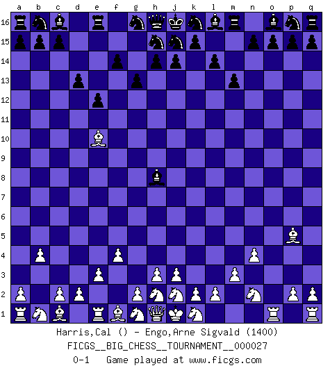 Last move : 0-1 2008 October 21 22:11:15 [Event "FICGS__BIG_CHESS__TOURNAMENT__000027"] [Site "FICGS"] [Date "2008.09.06"] [Round "1"] [White "Harris,Cal"] [Black "Engo,Arne Sigvald"] [Result "0-1"] [WhiteElo ""] [BlackElo "1400"] 1.f2-f4 l15-l14 2.n2-n4 f15-f14 3.o1-d11 e15-e13 4.b2-b4 m15-m13 5.m2-m3 d15-d13 6.e2-e3 f16-c13 7.l1-p5 e13-e12 8.d11-e10 c13-o2 9.p1-n2 g15-g13 10.m1-o1 o2-h8 0-1 Follow this game move after move (download)Though most people love to look at the games of the great attacking masters, some of the most successful players in history have been the quiet positional players. They slowly grind you down by taking away your space, tying up your pieces, and leaving you with virtually nothing to do ! (Yasser Seirawan) Ein Buch ist ein Spiegel; wenn ein Affe hineinsieht, so kann kein Apostel heraus gucken. (Georg Christoph Lichtenberg) Cuando tengo las piezas blancas, yo gano porque soy blanco; Cuando tengo las piezas negras, yo gano porque soy Bogolyubov. (Bogolyubov) Comme les marins qui ont mille raisons différentes d'aller en mer, les joueurs d'échecs en ont tout autant avant de s'installer devant une table et jouer... (Vincent Bertignac, philosophe) Don't be discouraged. It's often the last key in the bunch that opens the lock. (Author unknown)