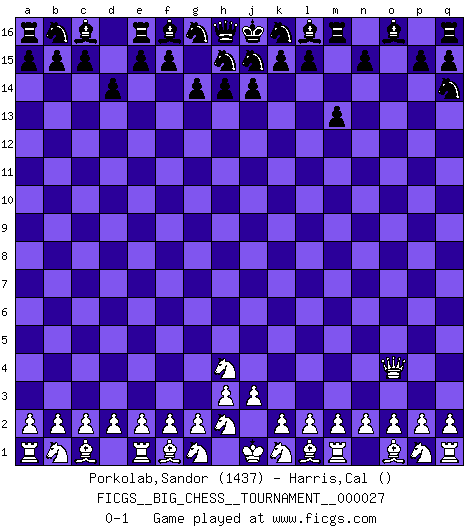Last move : 0-1 2008 October 23 12:34:22 [Event "FICGS__BIG_CHESS__TOURNAMENT__000027"] [Site "FICGS"] [Date "2008.09.06"] [Round "1"] [White "Porkolab,Sandor"] [Black "Harris,Cal"] [Result "0-1"] [WhiteElo "1437"] [BlackElo ""] 1.j2-h4 m15-m13 2.h1-o7 g15-g14 3.o7-o15 p16-q14 4.o15-o4 d15-d14 0-1 This big chess game has been lost on time (started : 2008.09.06 22:2:3) Follow this game move after move (download)We like to think. (Gary Kasparov) Wer wird heute Abend ihr Gegner sein? -- Heute Abend spiele ich gegen die schwarzen Steine. (Akiba Rubinstein) El Ajedrez se juega con la mente... ¡no con las manos!. (Renaud y Kahn) Si le désir cupide (et stupide) de gagner est une inépuisable source de souffrance, une combinaison brillante sur l'échiquier est une découverte : le coquelicot qui s'épanouit lorsque apparaît la Voie Lactée. (Arrabal) It's not enough to succeed. Others must fail. (Gore Vidal)
